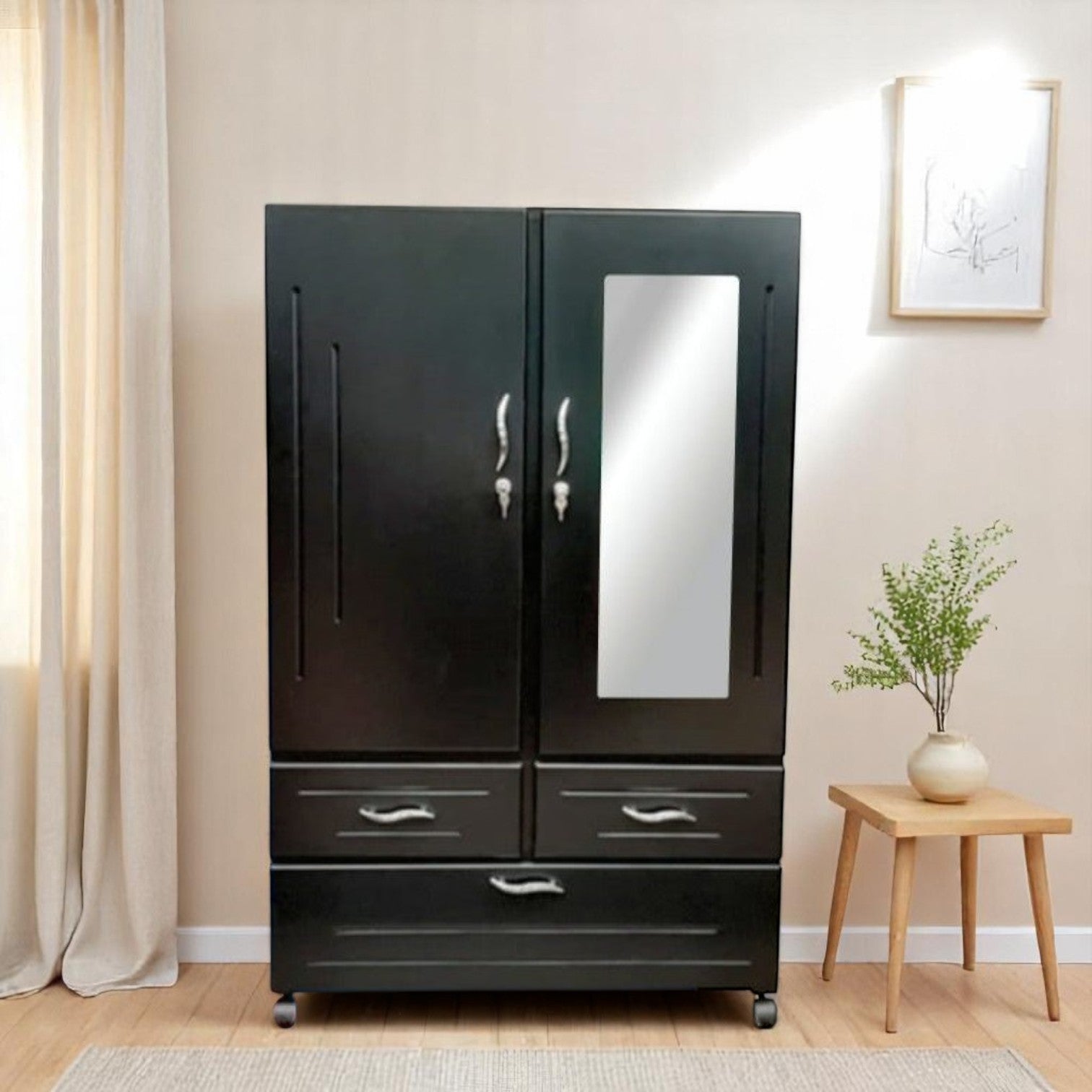 🛏️ Disponible en colores versátiles como negro, caramelo, caoba y blanco, su acabado en pintura vinílica le da un toque elegante y resistente. 🔐 Chapas metálicas en las puertas para mayor protección. 🛞 Rodachines integrados que facilitan moverlo sin esfuerzo.