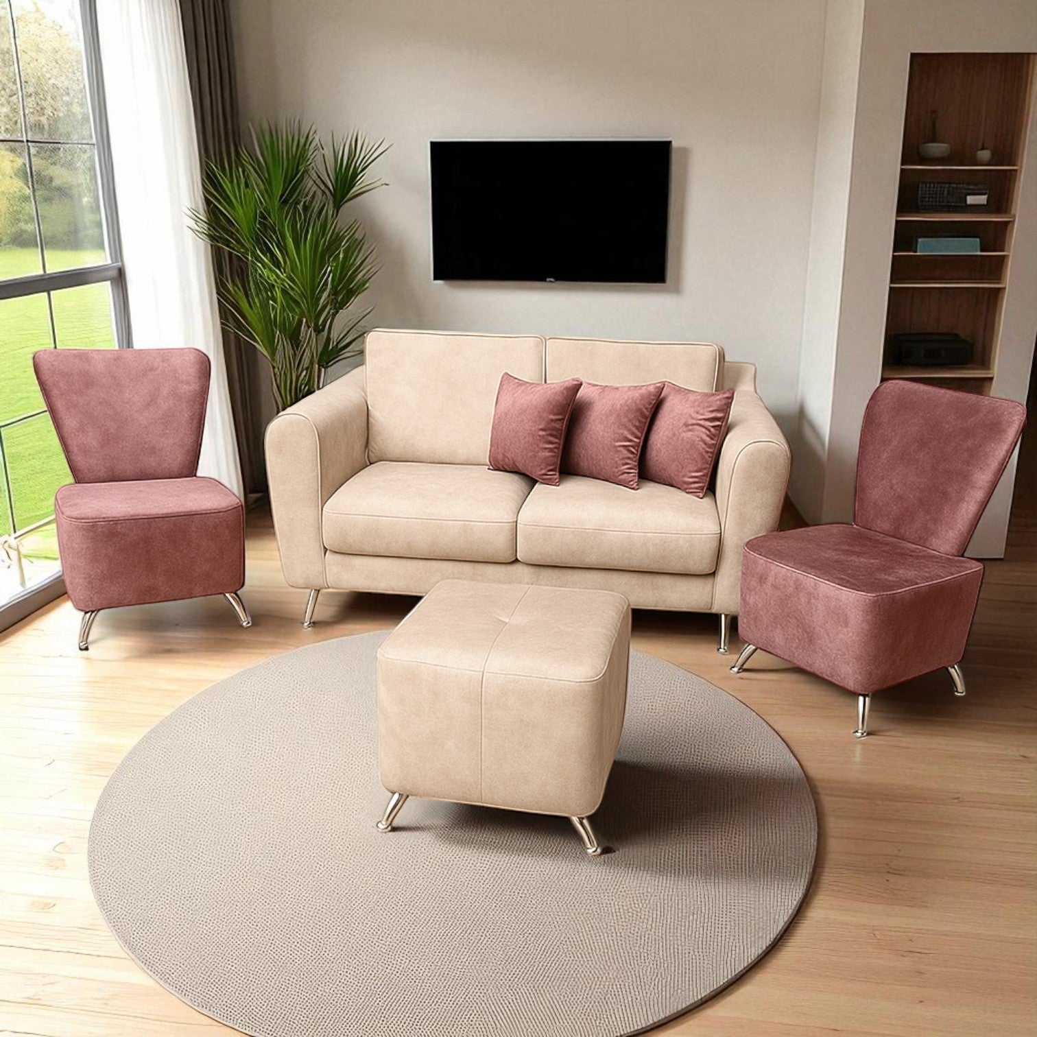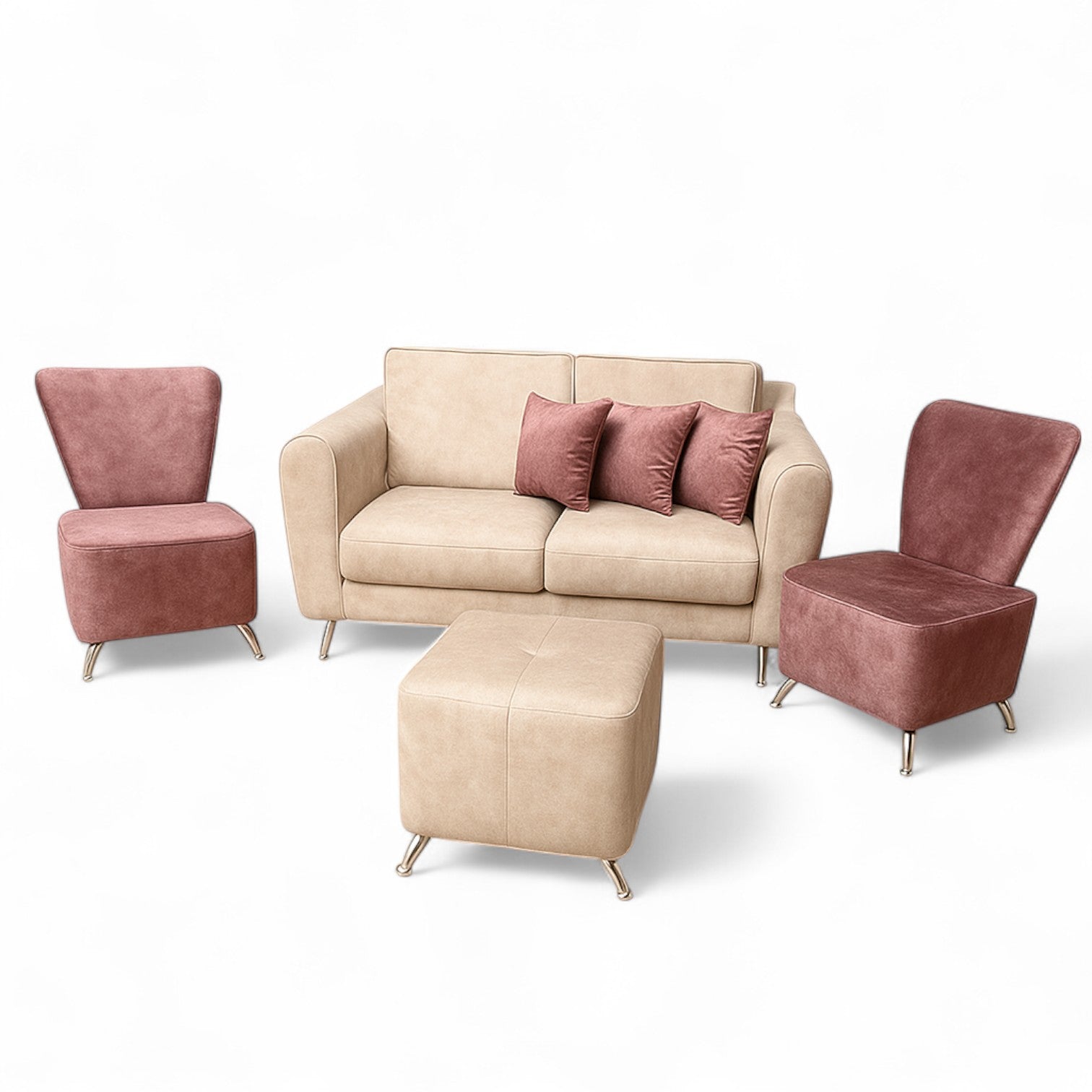 - Incluye: sofá de dos puestos, dos sillas auxiliares y puff multifuncional.