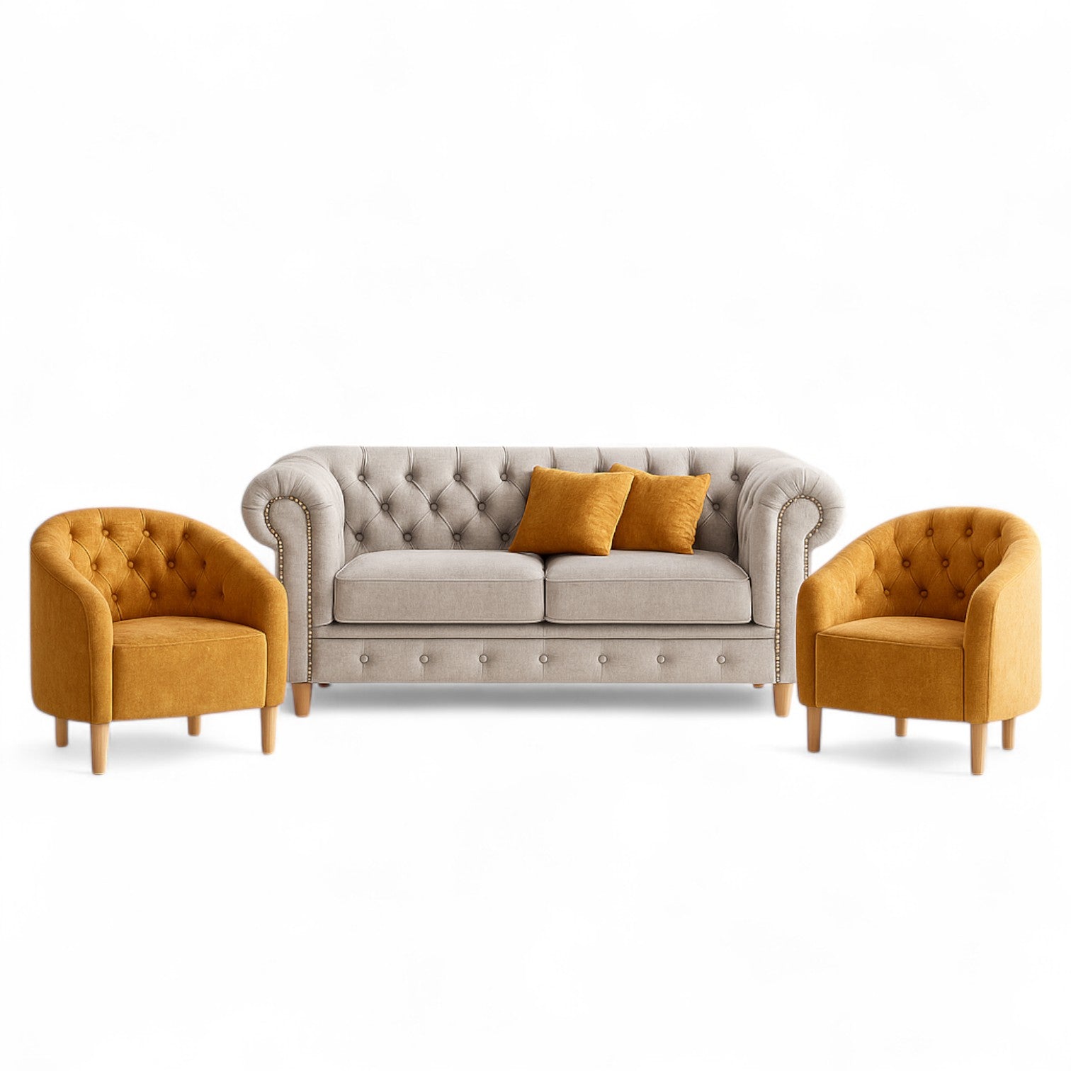 - Incluye: sofá Hércules (estilo chester) y dos sillas auxiliares Tokio.