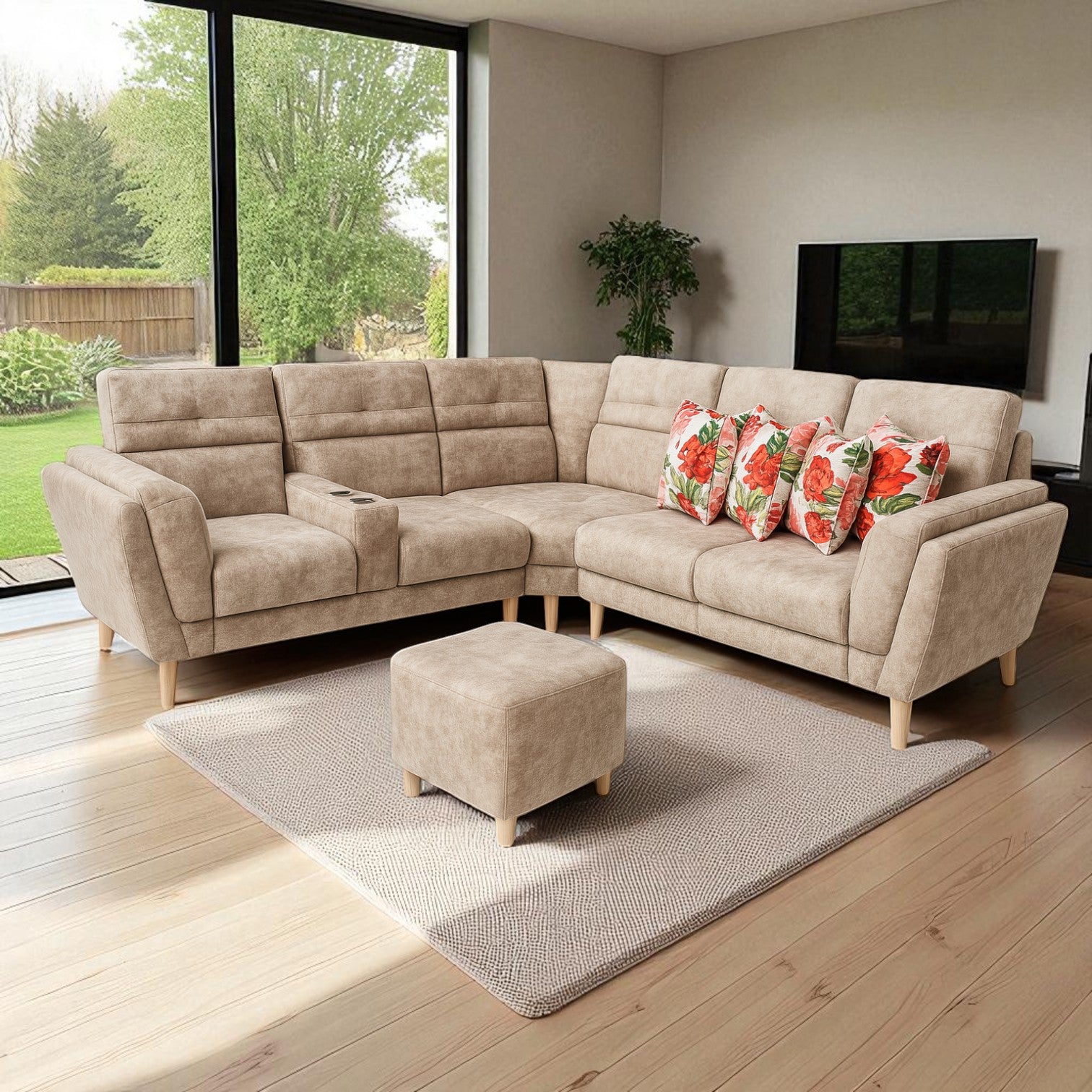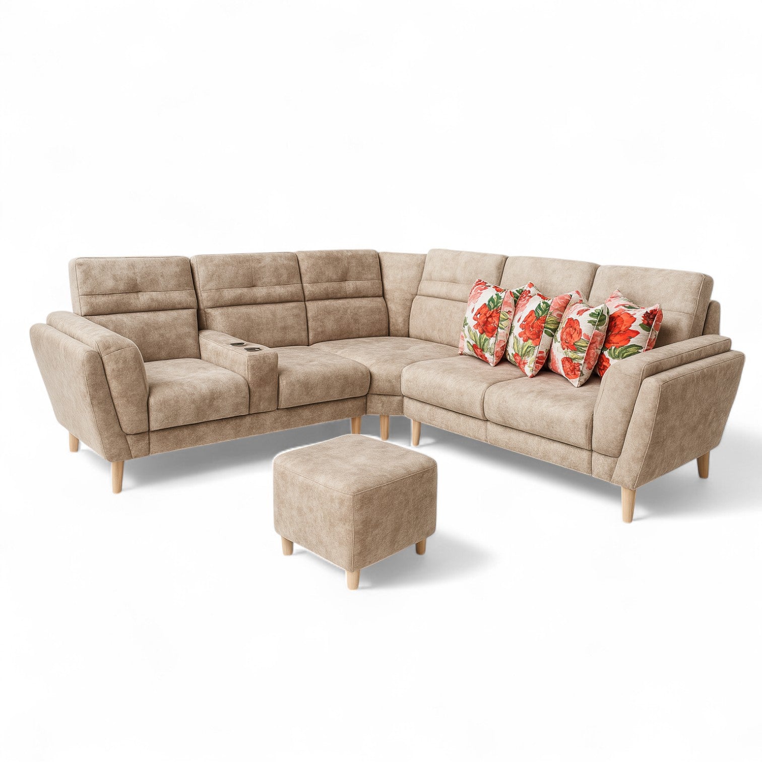 La Sala Rihana es perfecta para quienes buscan un diseño moderno y acogedor. Su estructura modular en forma de L incluye apoya cabezas ajustables y un práctico porta vasos integrado que eleva tu experiencia de descanso y entretenimiento. Además, su tapizado en tela antifluido garantiza fácil limpieza y su espuma de alta densidad brinda máximo confort.