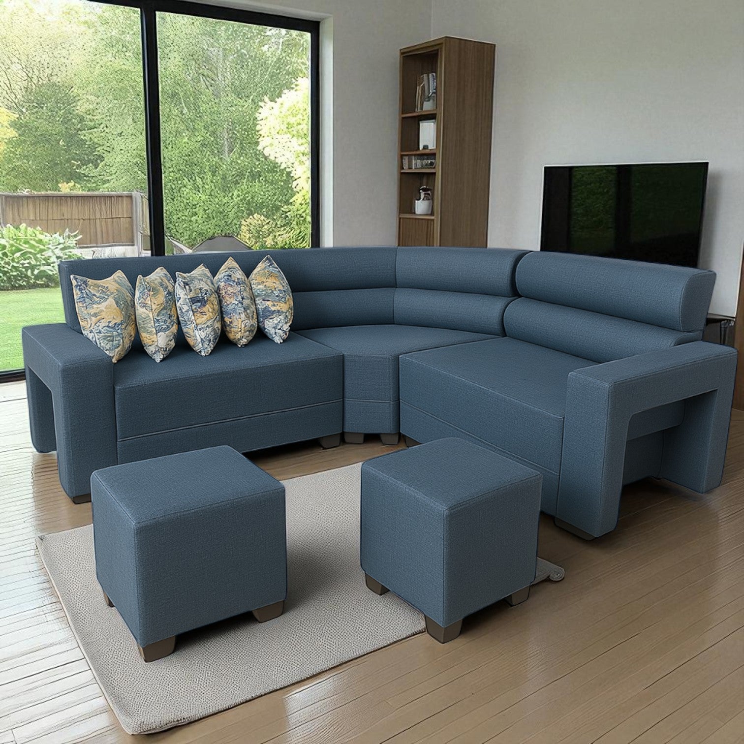 - Incluye: sala modular en L con puffs auxiliares y cojines decorativos.