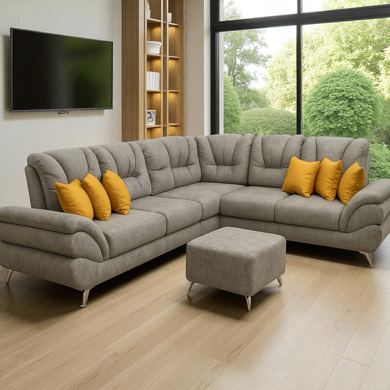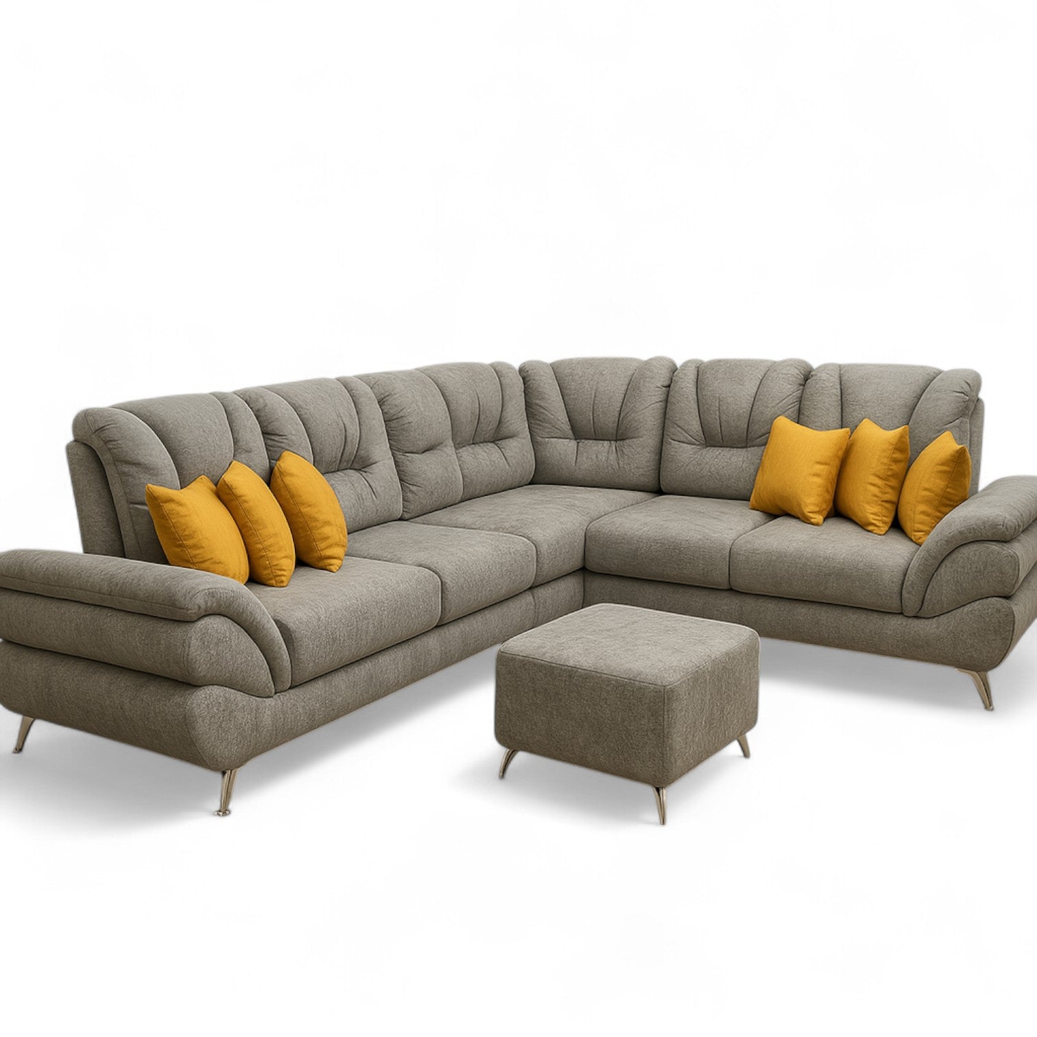 - Incluye: sala en L con puff auxiliar y cojines decorativos.