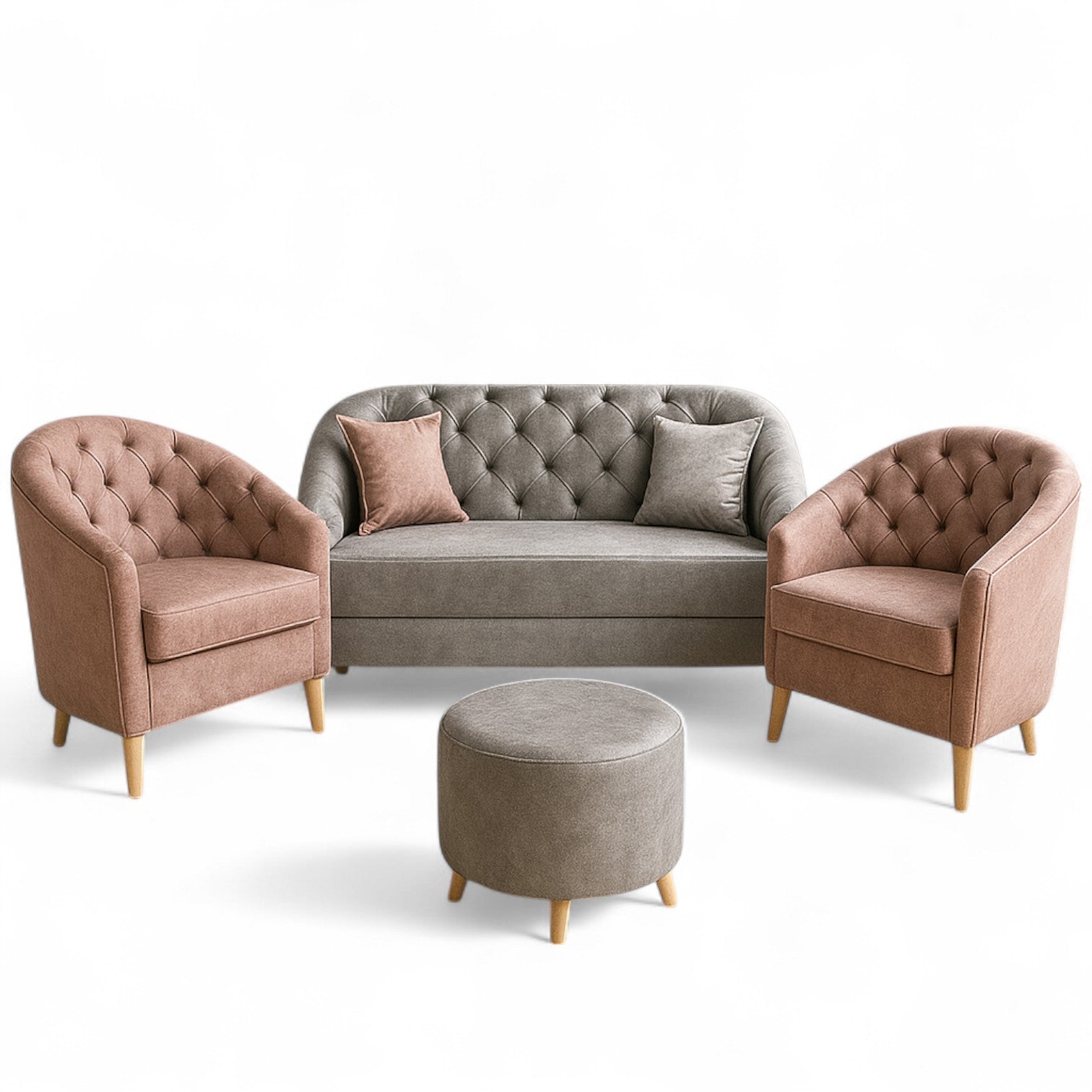 - Incluye: sofá de tres puestos, dos sillas auxiliares y puff redondo.
